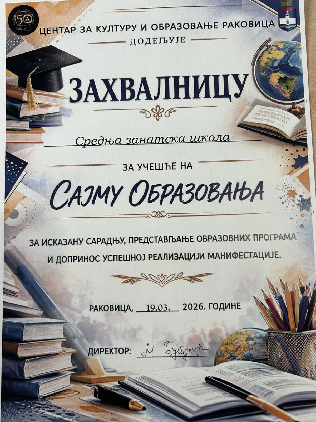 У четвртак, 19.03.2026. Средња занатска школа, учествовала је на Сајму образовања у Центру за културу и образовање Раковице. Наше колеге и колегиниca Милица Миловић, Никола Поповић, Дејан Трипковић и Ненад Бојаџић с поносом су представили нашу школу у правом светлу, отворену за све ђаке који желе да негују образовање у циљу да у будућности буду професионалци у свом занату и да самостално корачају кроз живот. Веома смо захвални на овом учешћу и желимо топлу добродошлицу будућим ученицима.
